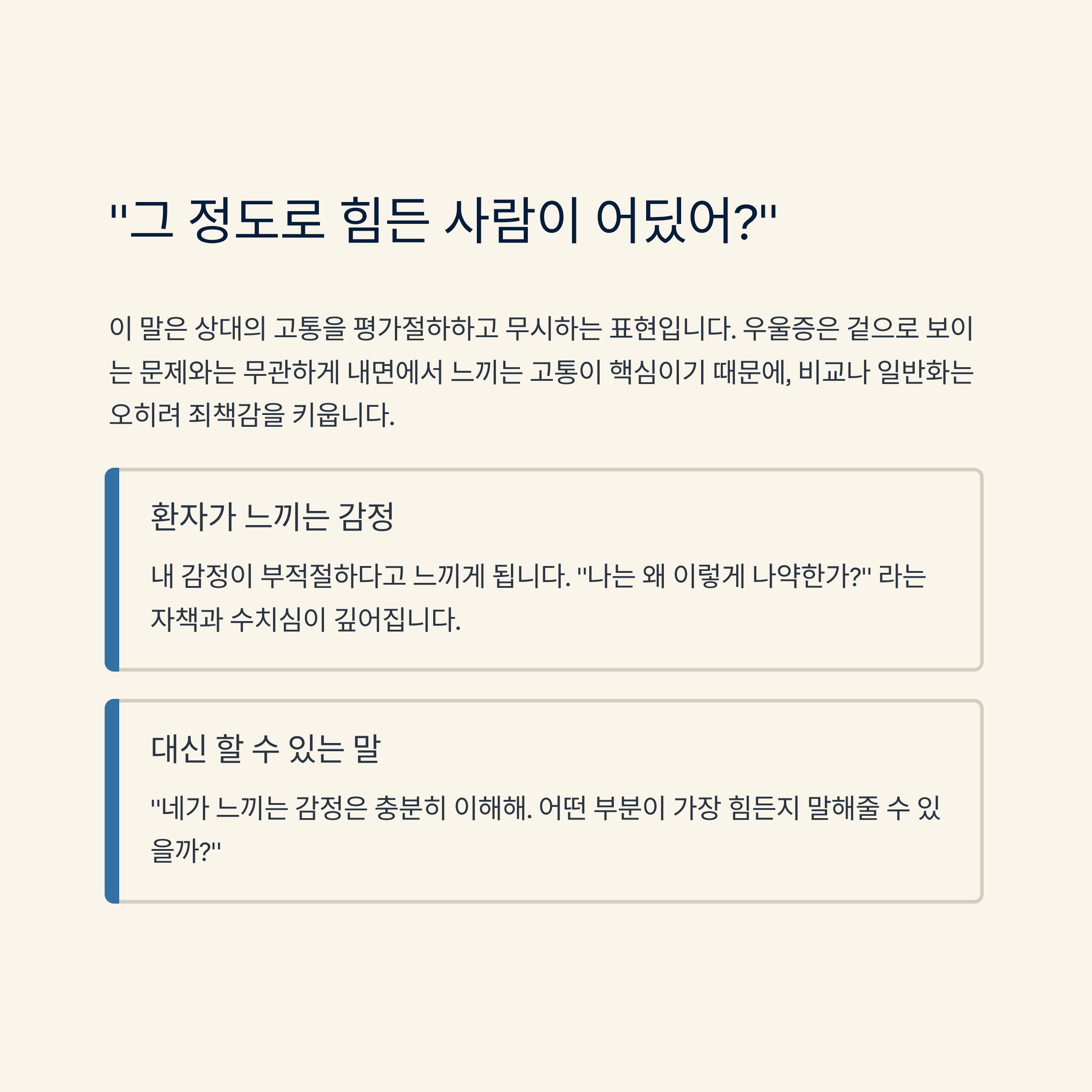 우울증은 겉으로 보이는 문제와는 무관하게 내면에서 느끼는 고통이 핵심이기 때문에, 비교나 일반화는 오히려 죄책감을 키웁니다. 감정은 숫자로 나눌 수 있는 것이 아닙니다.