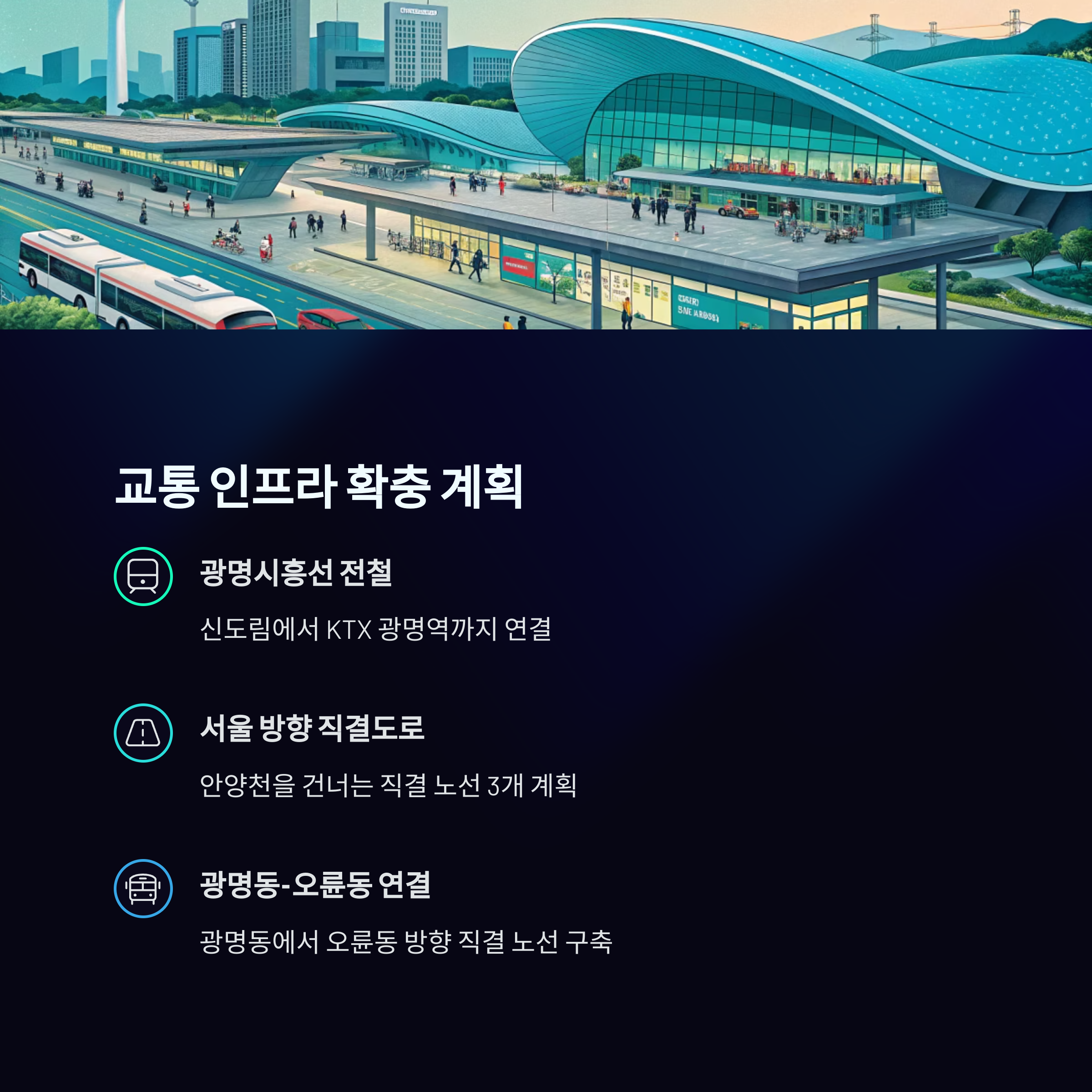 또한, 안양천을 건너 서울 방향으로 가는 직결 노선 3개와 광명동 쪽에 오륜동 쪽으로 향하는 직결 노선도 계획되어 있어 교통 대책이 잘 수립되고 있습니다.