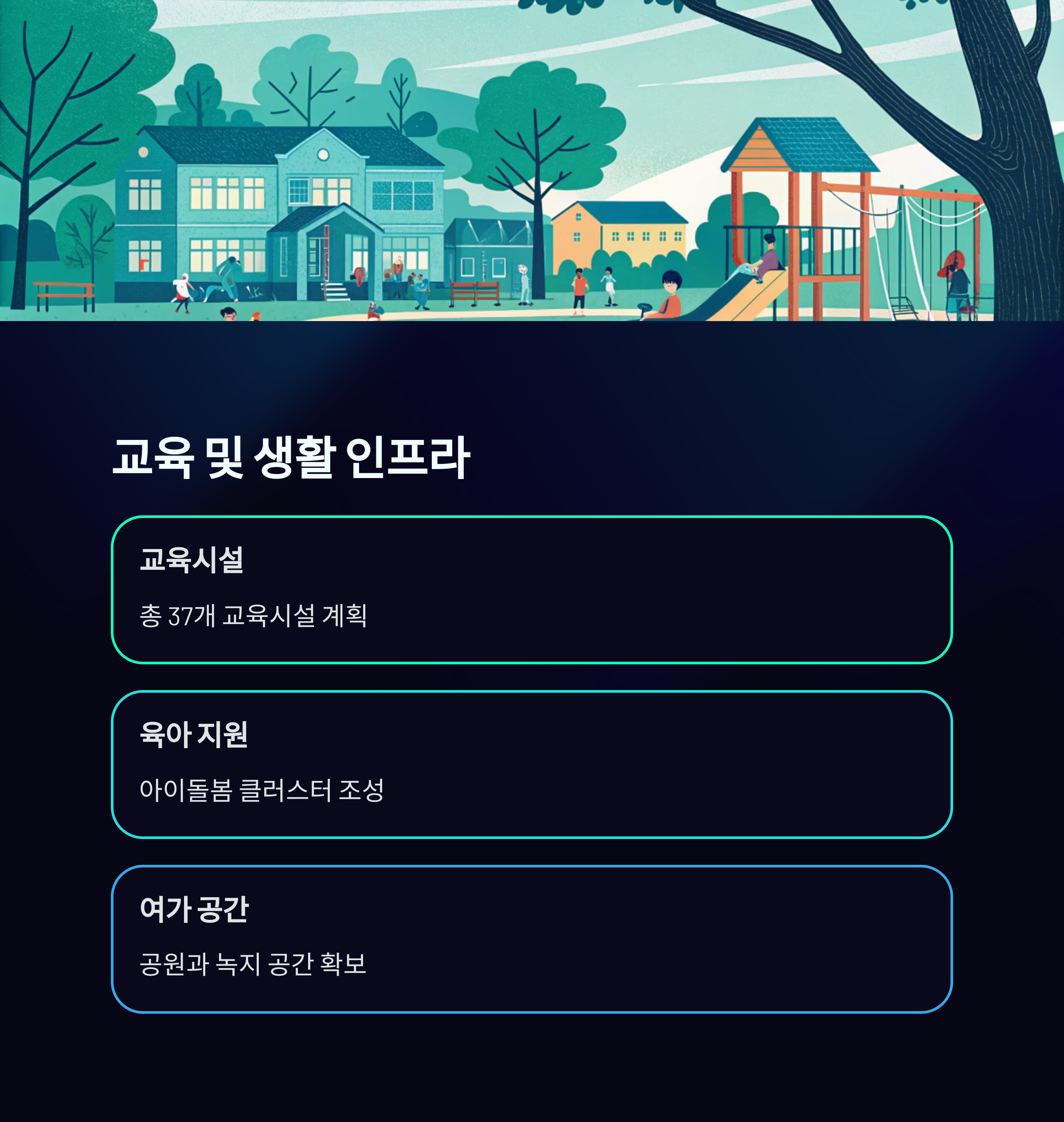 광명시흥 신도시는 교육과 생활 인프라를 강화하여 가족 친화적인 도시로 발전할 계획입니다. 총 37개의 교육시설이 계획되어 있으며, 아이돌봄 클러스터를 포함한 다양한 육아 지원 시설도 조성될 예정입니다. 또한, 공원과 녹지 공간이 충분히 확보되어 주민들에게 여가와 휴식을 제공할 수 있는 환경이 마련될 것입니다.