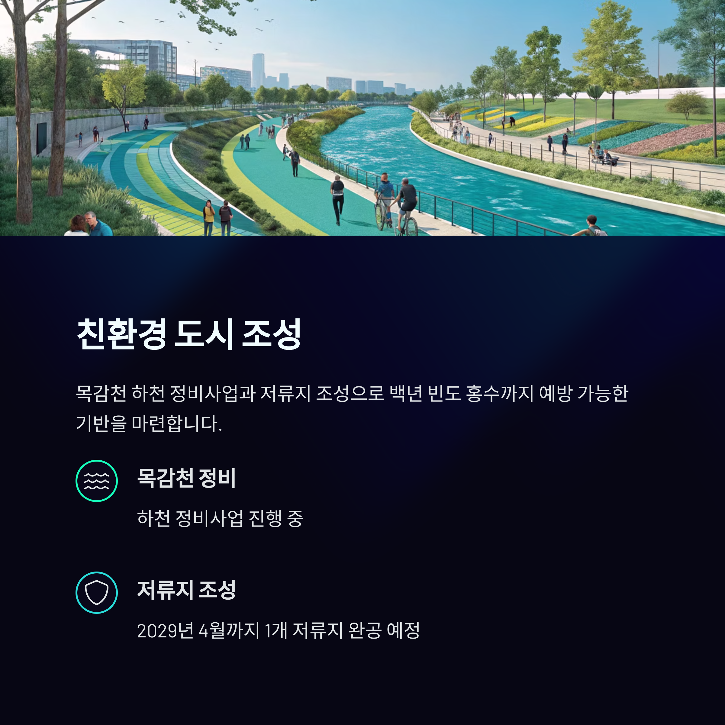 광명시흥 신도시는 친환경 도시로 발전하기 위해 목감천 하천 정비사업을 포함한 치수 대책이 진행되고 있습니다. 특히, 목감천을 가로지르는 저류지 조성 사업이 본격화되어 2029년 4월까지 1개 저류지가 조성될 예정입니다. 이를 통해 백년 빈도 홍수까지 예방할 수 있는 기반이 마련될 것입니다.