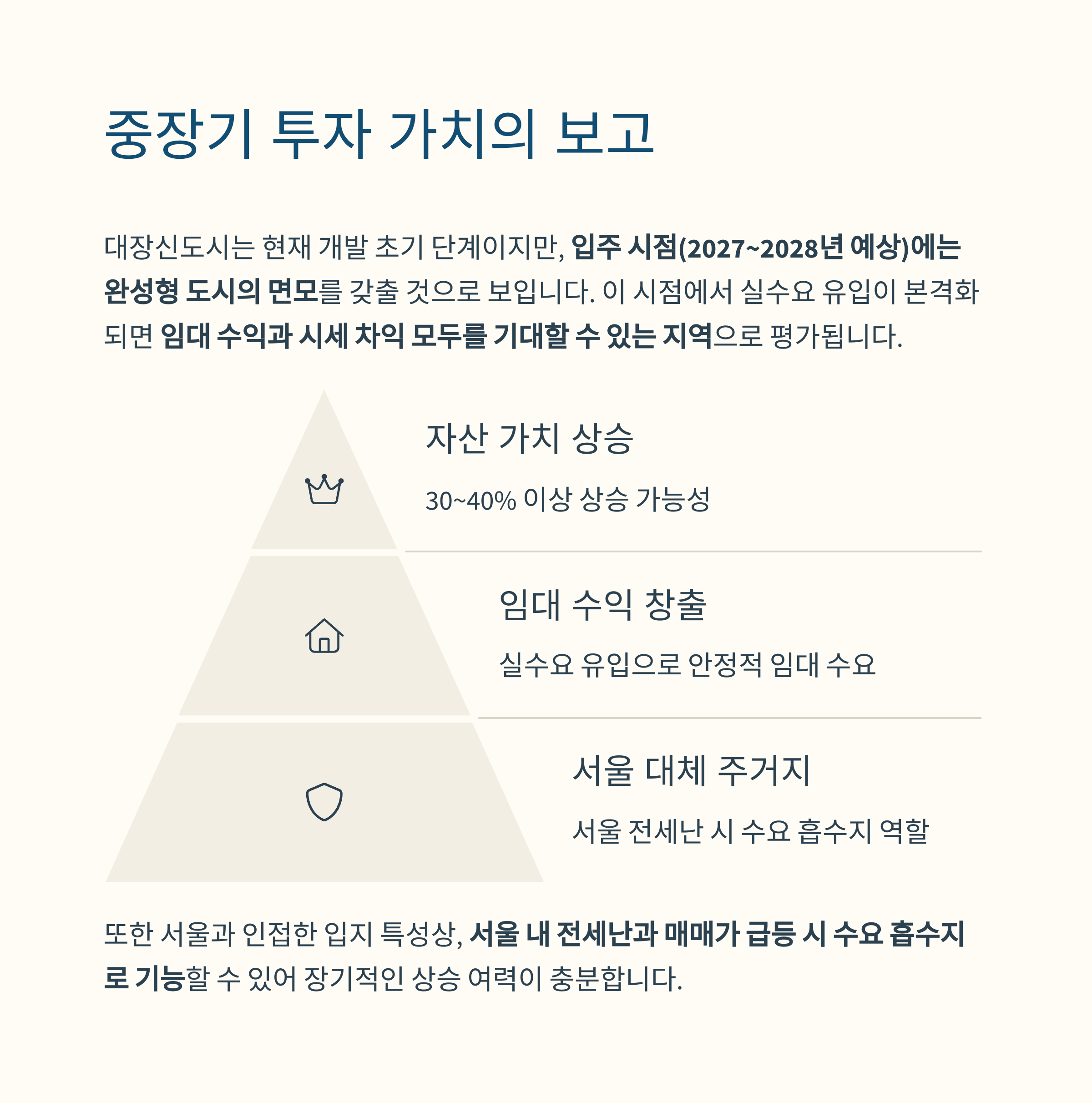 대장신도시는 현재 개발 초기 단계이지만, 입주 시점(2027~2028년 예상)에는 완성형 도시의 면모를 갖출 것으로 보입니다.