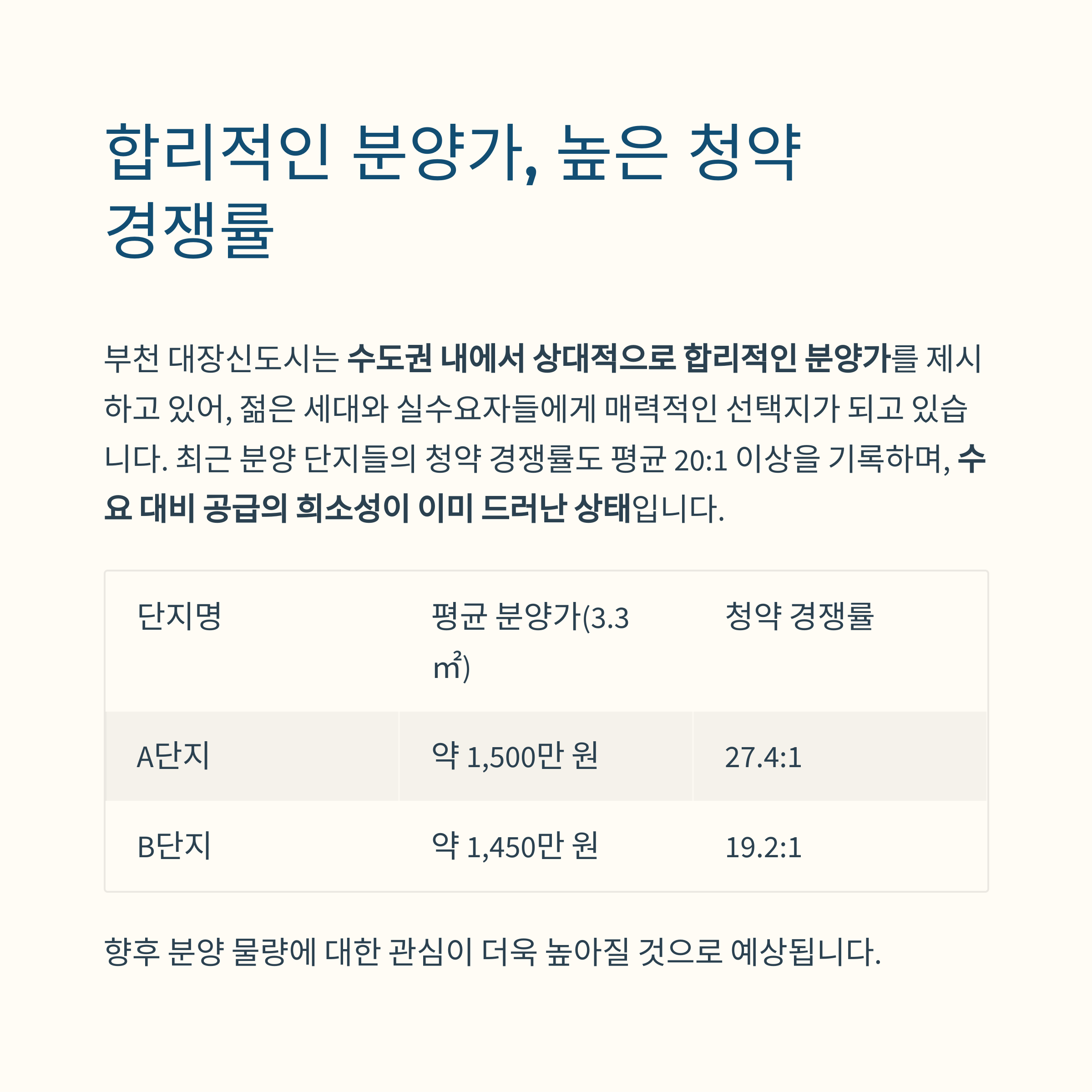 부천 대장신도시는 수도권 내에서 상대적으로 합리적인 분양가를 제시하고 있어, 젊은 세대와 실수요자들에게 매력적인 선택지가 되고 있습니다.