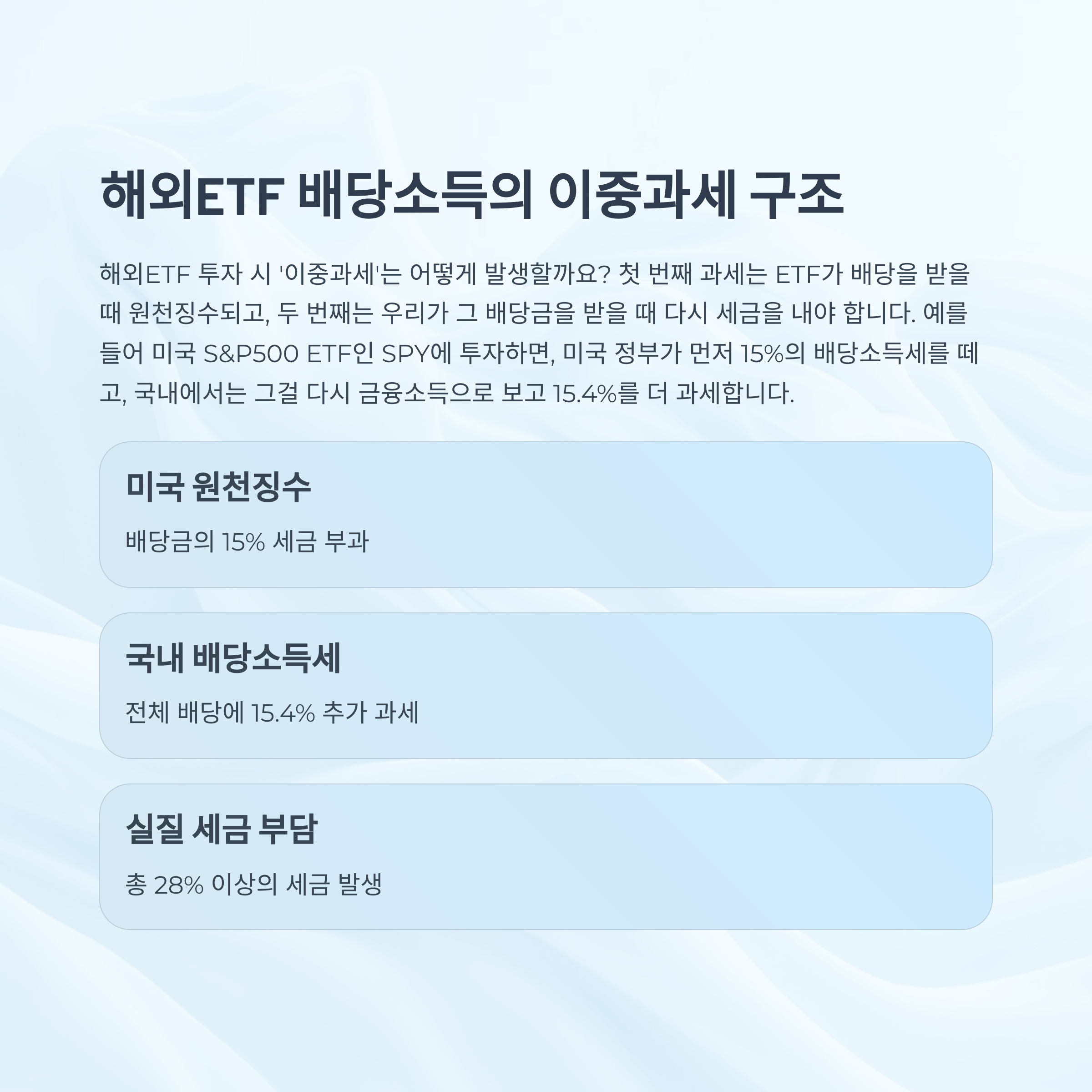 해외ETF에 투자하면 기본적으로 '이중과세' 문제에 부딪히게 됩니다. 첫 번째 과세는 ETF가 배당을 받을 때 원천징수되고, 두 번째는 우리가 그 배당금을 받을 때 다시 세금을 내야 한다는 거죠. 예를 들어 미국의 S&P500 ETF인 SPY에 투자하면, 미국 정부가 먼저 15%의 배당소득세를 떼갑니다. 이후 국내에서는 그걸 다시 금융소득으로 보고 15.4%를 더 과세하죠. 이게 말 그대로 세금을 두 번 내는 구조입니다.