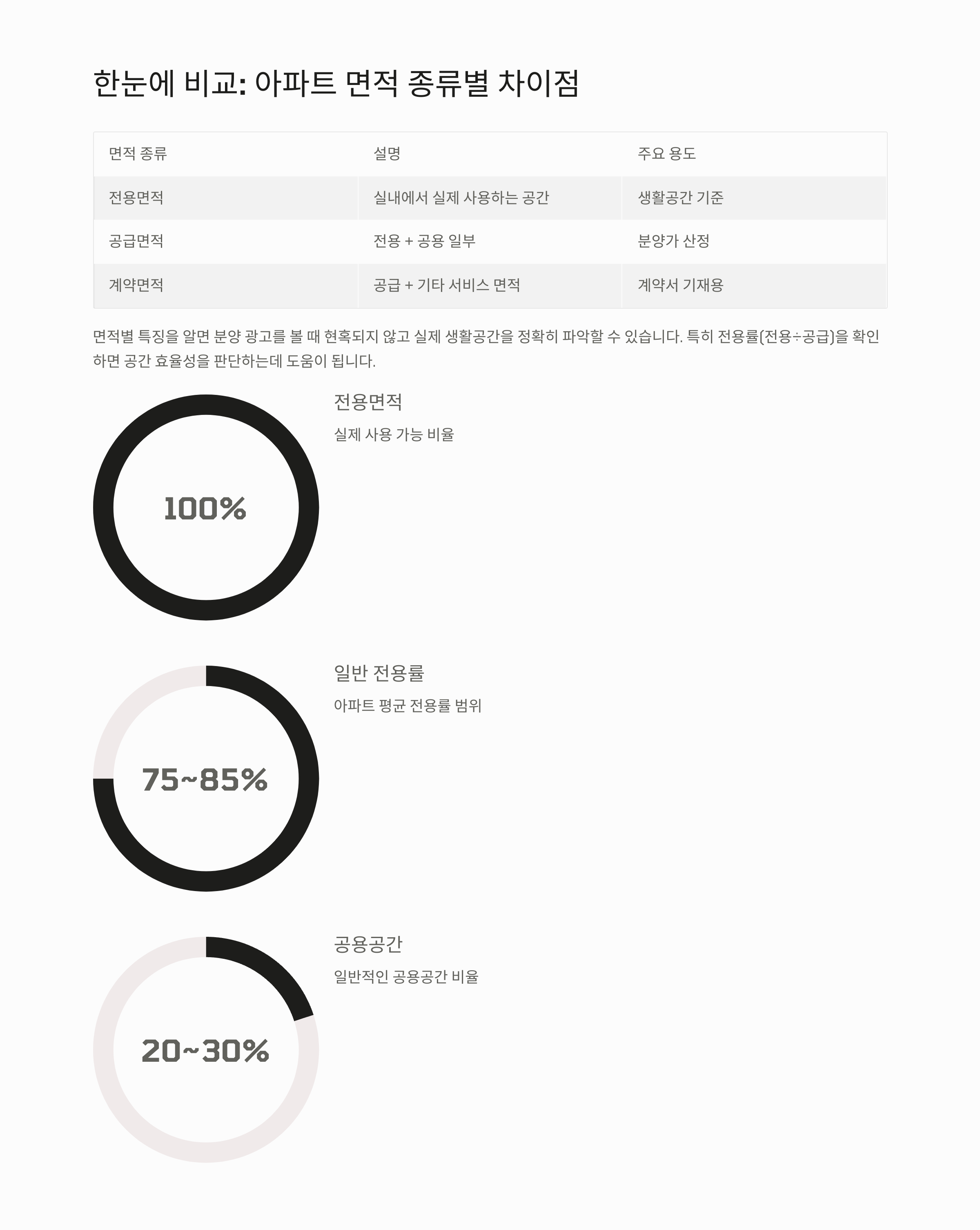복잡하게만 느껴지는 면적 용어들, 표로 정리해보면 훨씬 쉽게 이해돼요. 아래 표를 참고해보세요!