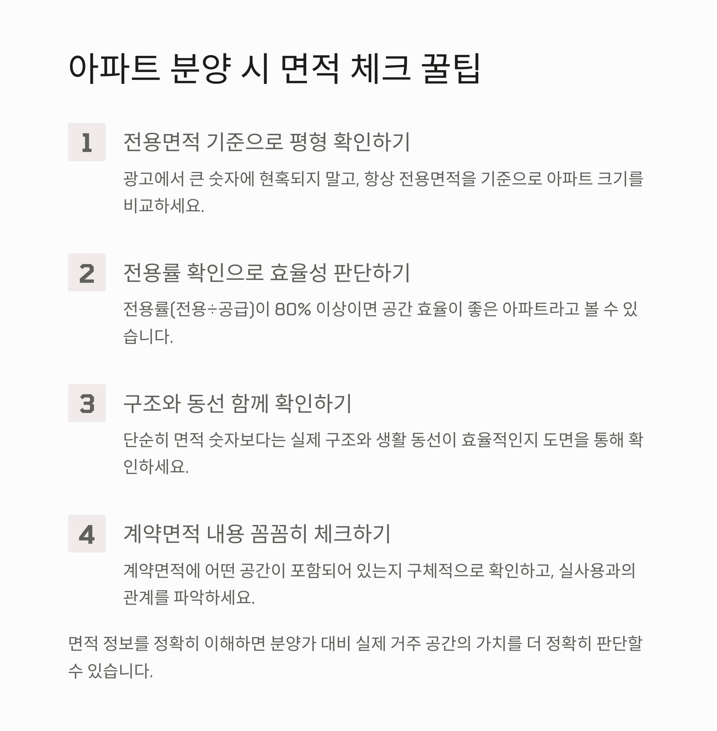 전용면적이 어떤 구조인지, 방 수와 동선이 내 생활방식에 맞는지 먼저 체크해보세요. 숫자보다 실제 거주감이 더 중요하니까요.