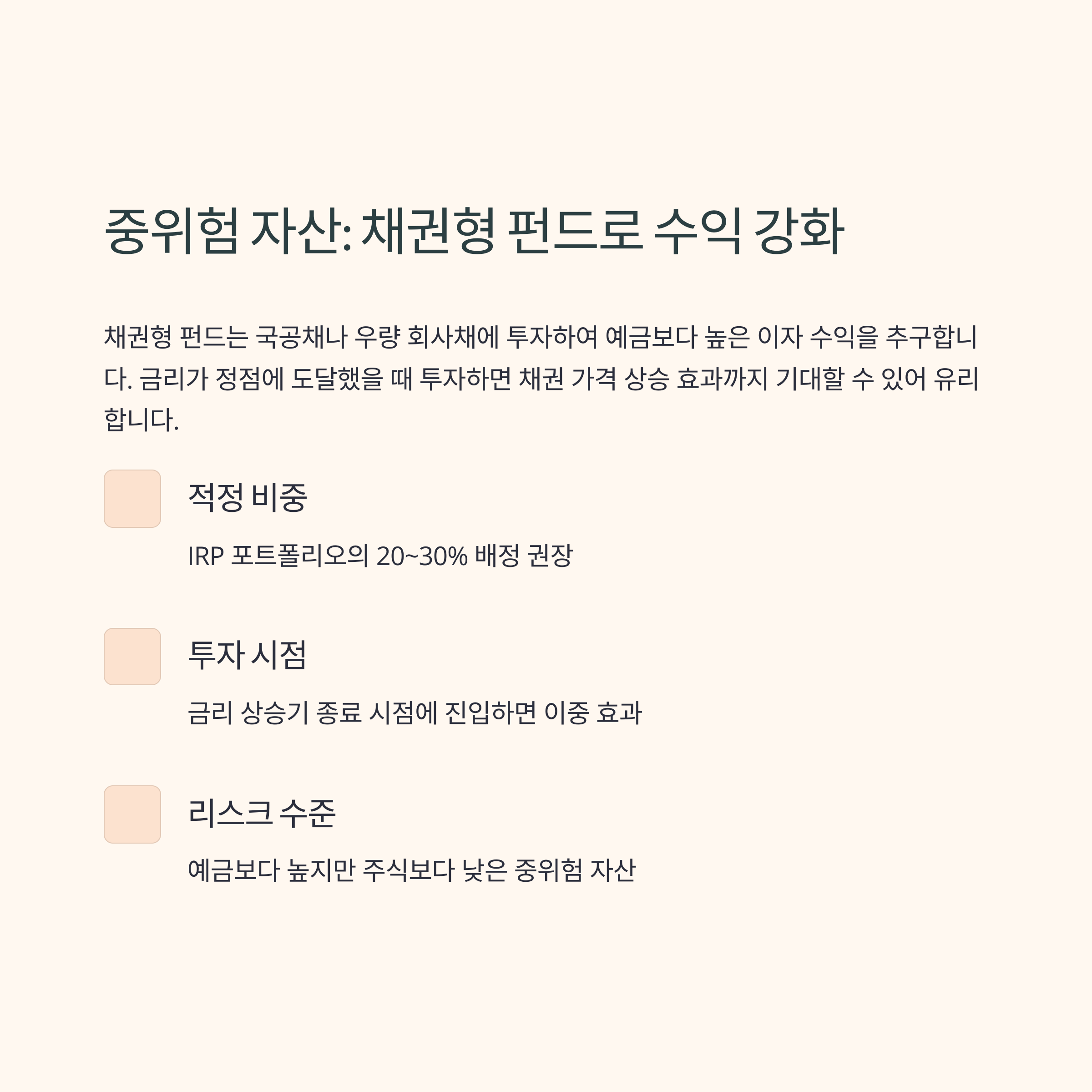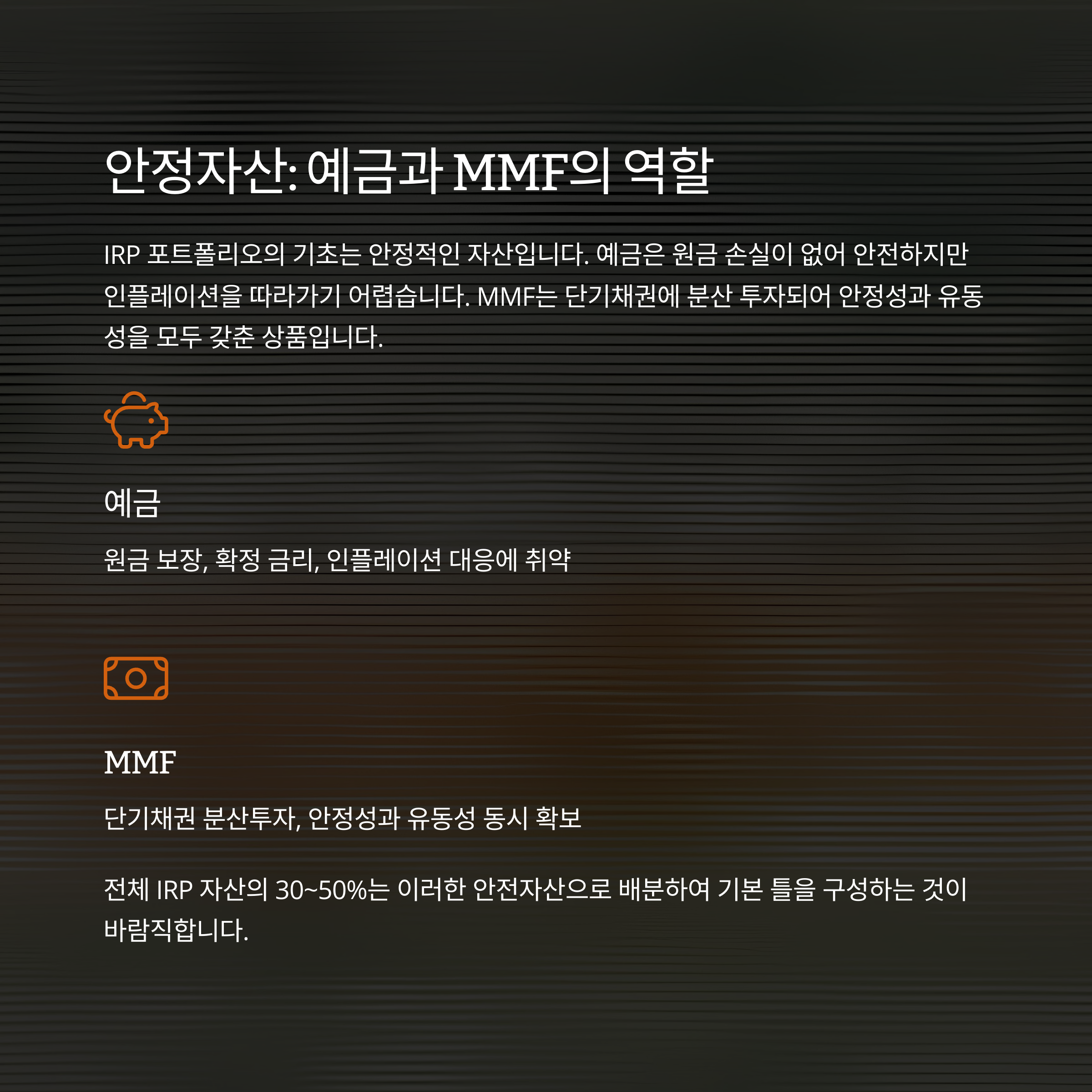 IRP에서는 중위험 자산으로, 예금 다음으로 비중을 두는 전략이 효과적입니다.