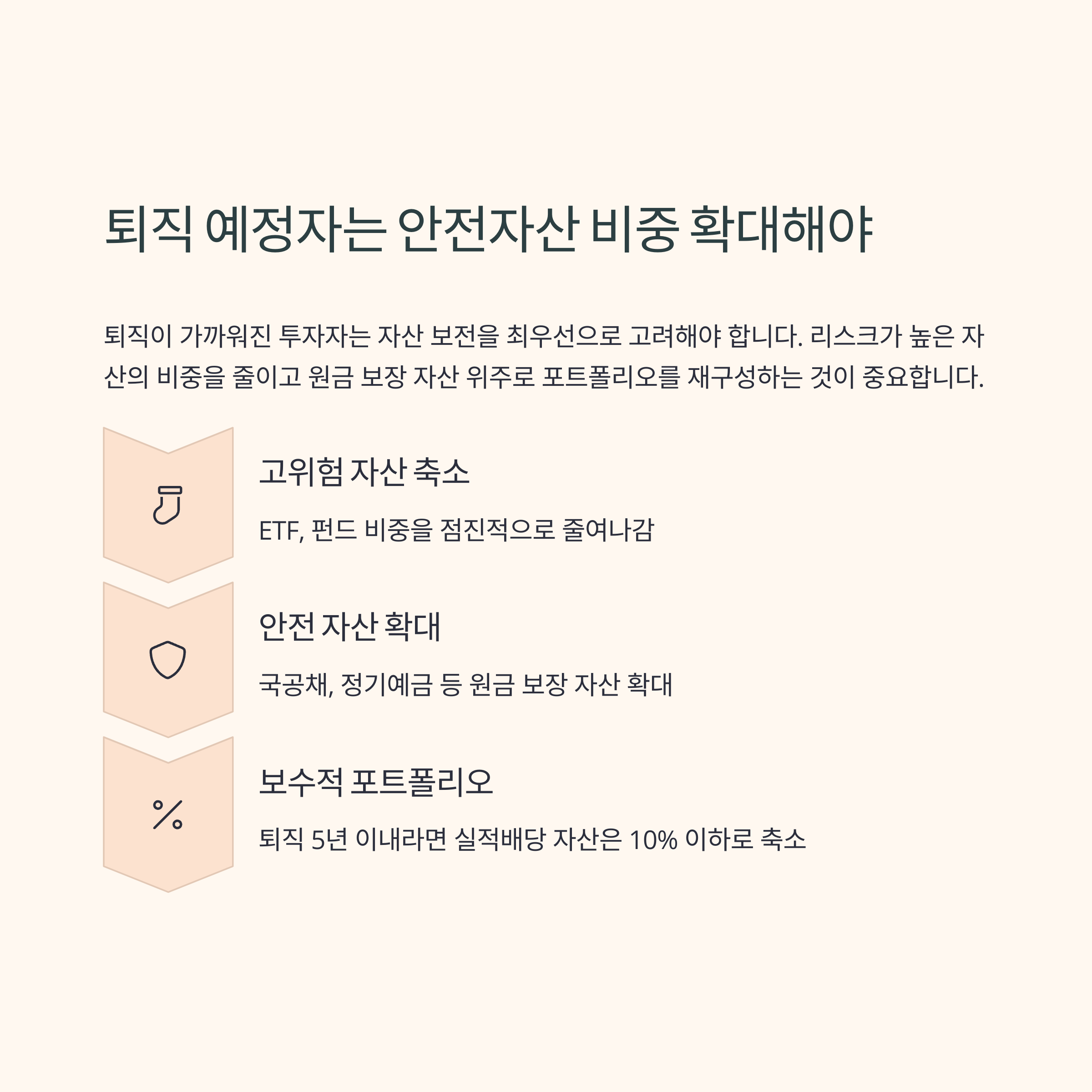 퇴직이 가까워진 투자자는 자산 보전을 최우선으로 고려해야 합니다.