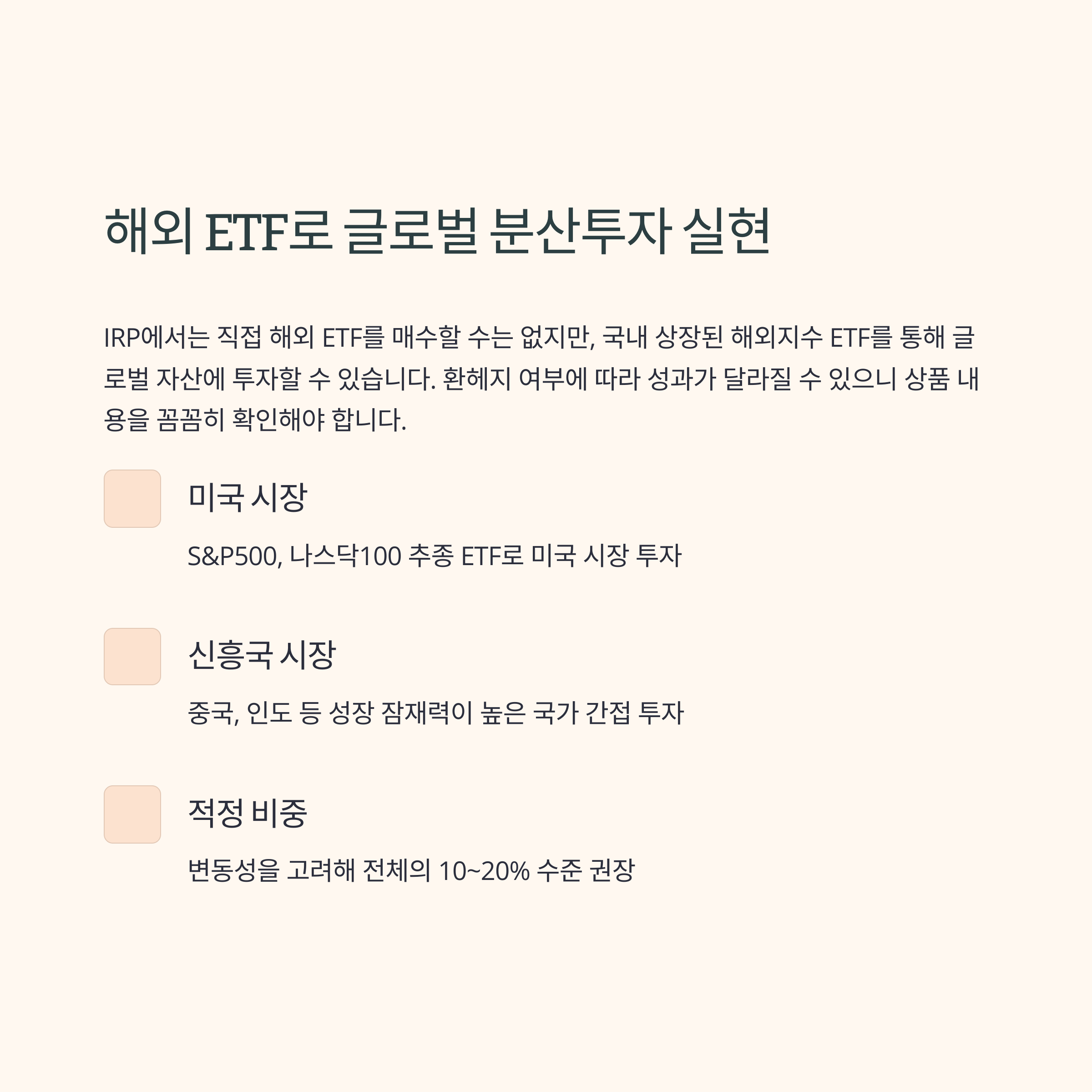 IRP에서는 직접적으로 해외 ETF를 거래할 수 없지만, 국내 증권사가 운용하는 해외지수 ETF로 대체할 수 있습니다.