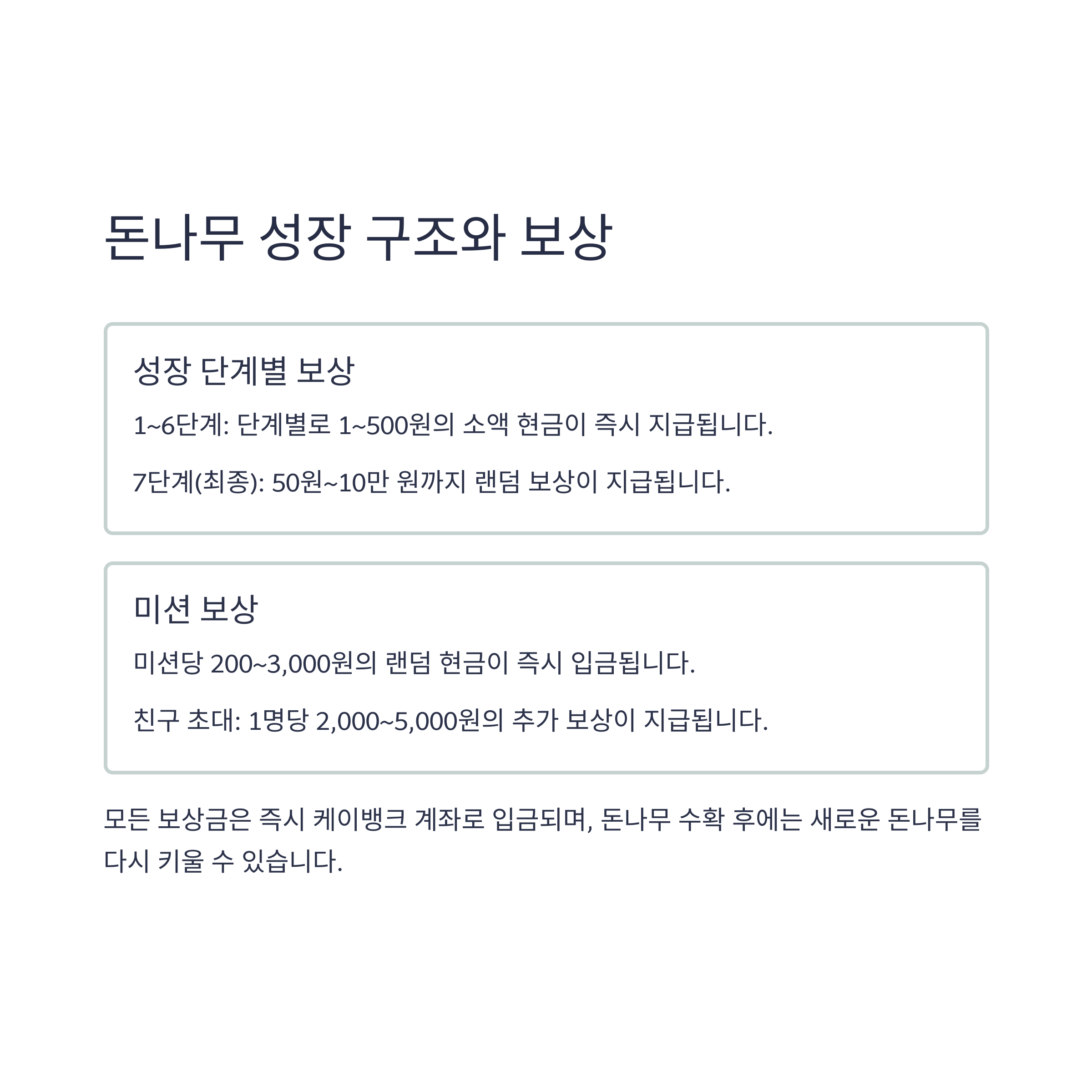 케이뱅크 ‘돈나무 키우기’는 매일 출석 체크와 간단한 미션 수행만으로 가상의 돈나무를 키우며 현금 보상을 받는 게임형 리워드 서비스입니다.