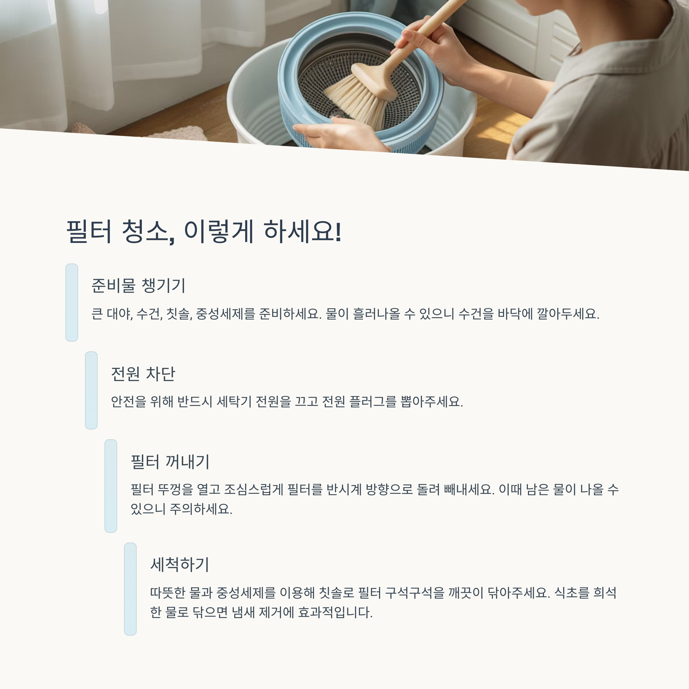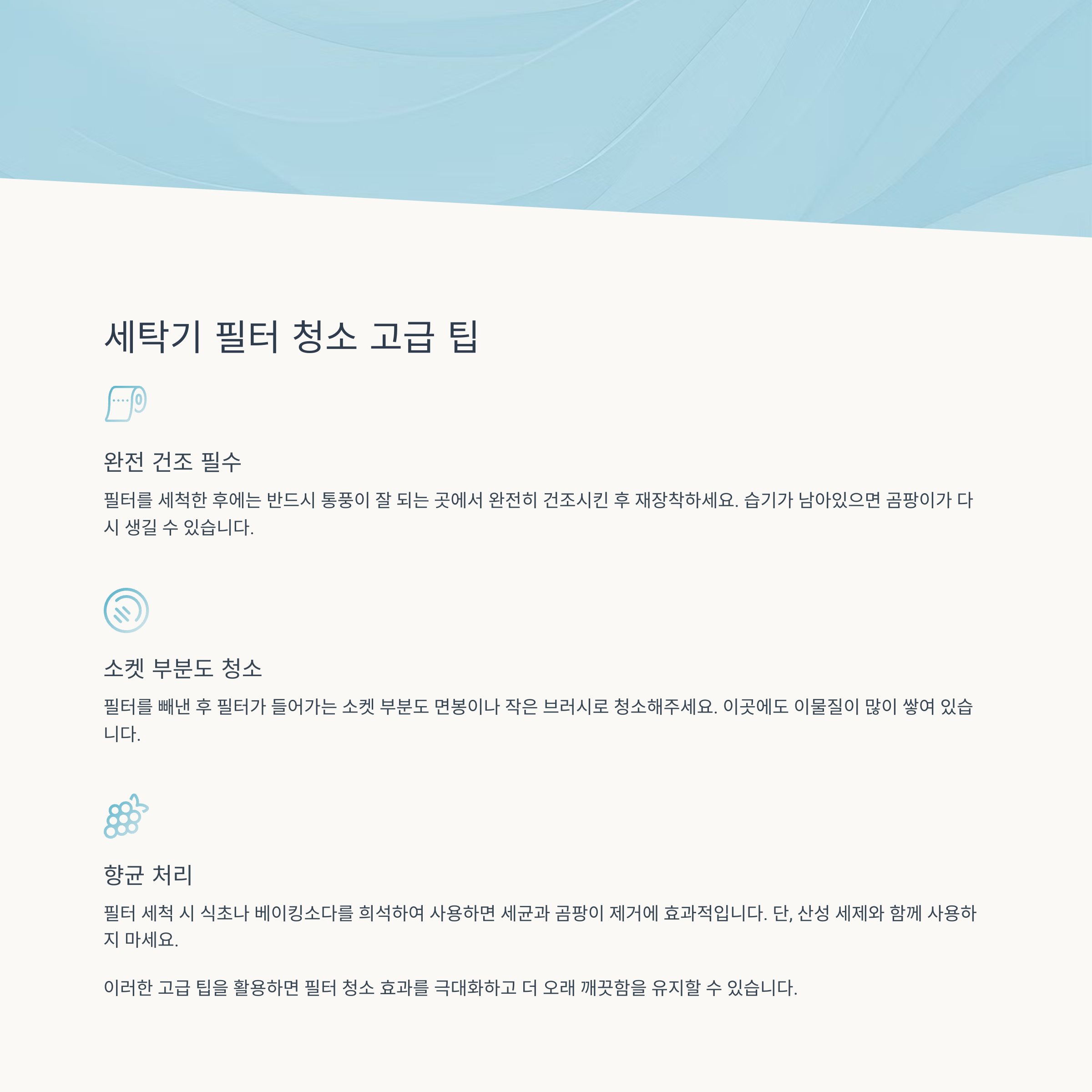필터 틈 사이 먼지와 세제 찌꺼기가 냄새 원인이 되기 때문에, 꼼꼼히 닦고 완전히 말리는 과정이 필요합니다.