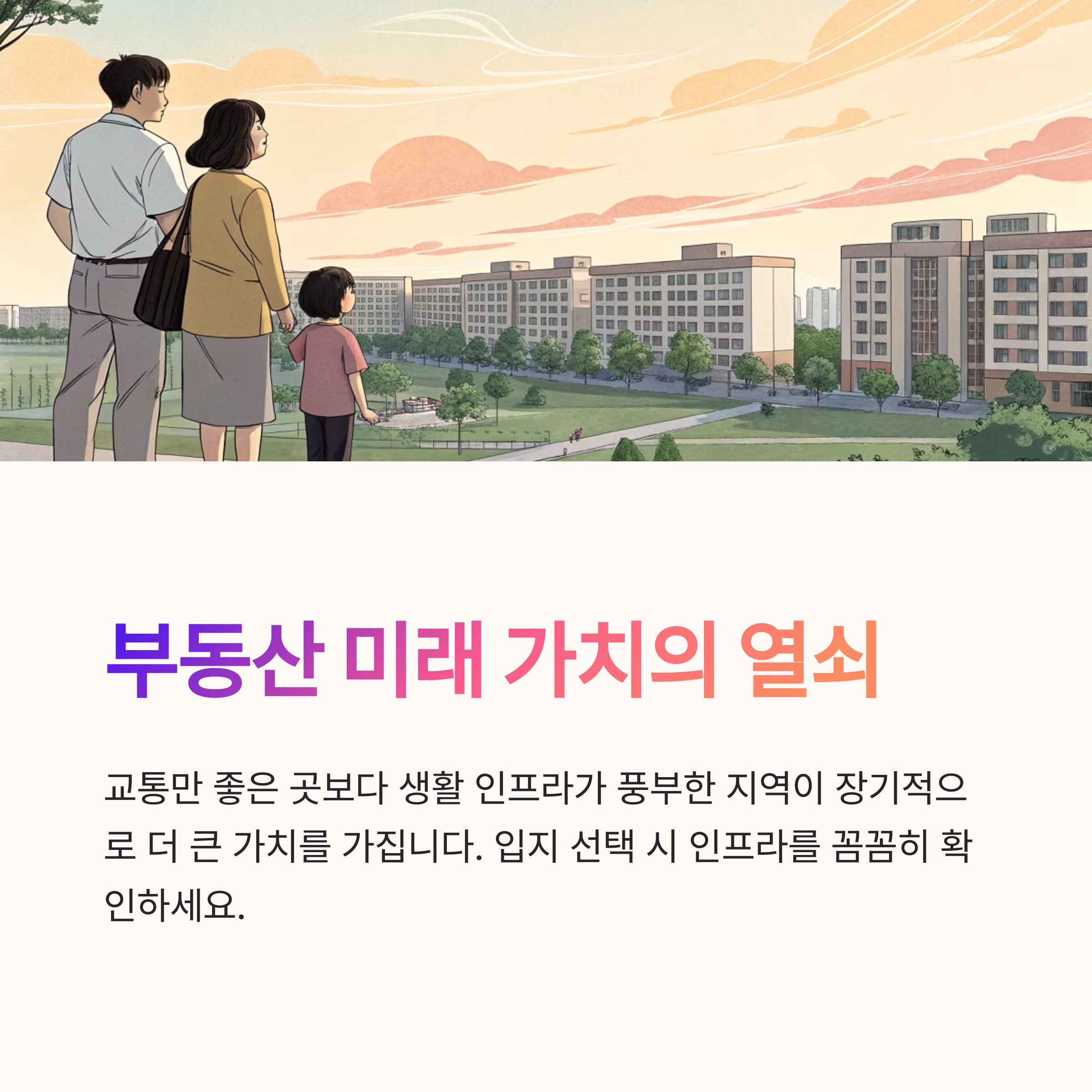 반면 교통만 좋아지고 생활 인프라가 부족한 지역은 거주 만족도가 낮아지고, 결국 실거주 수요의 이탈로 시세 유지가 어려워 질 수 있습니다.