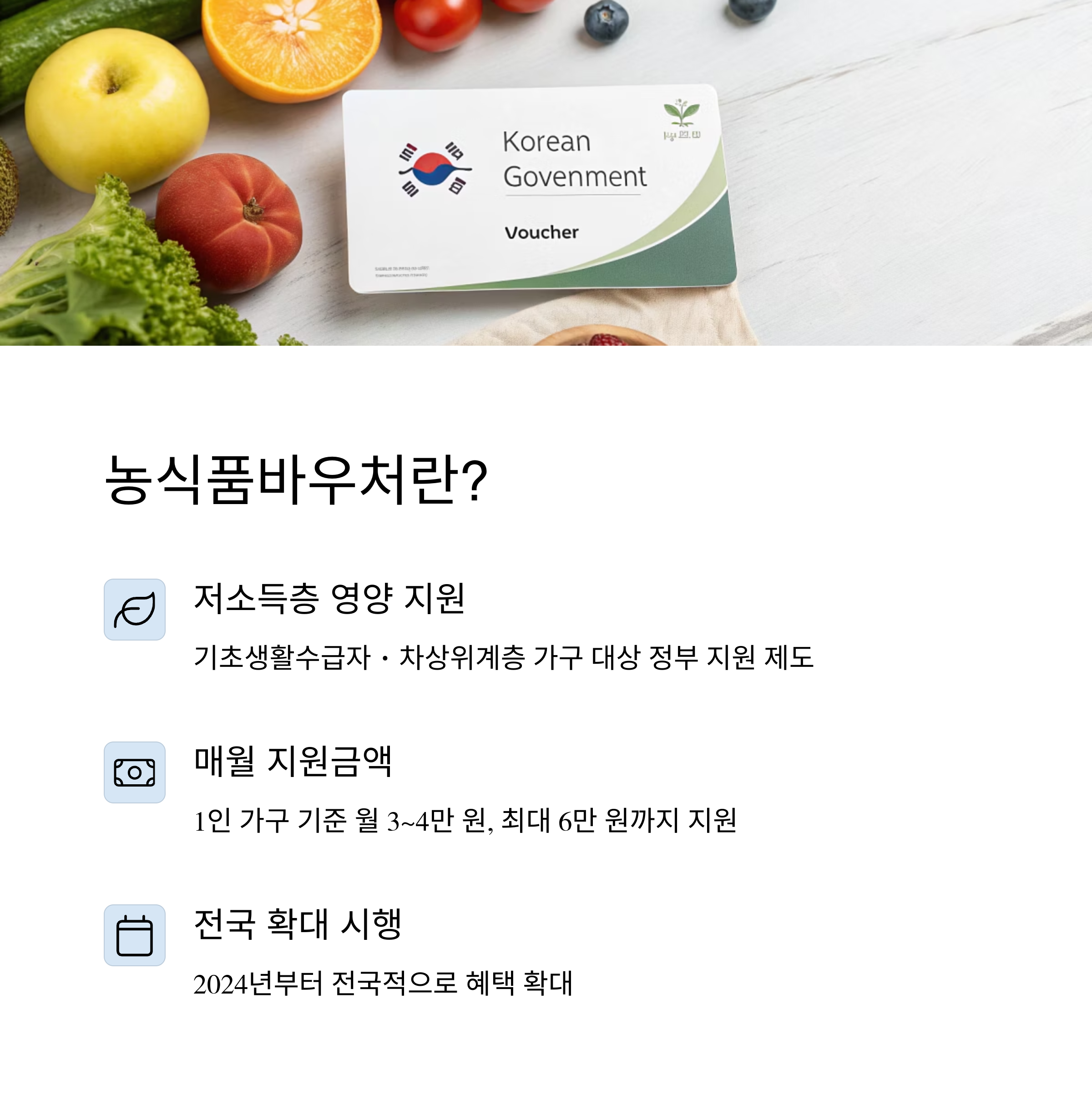 정부에서 지원하는 농식품바우처 제도, 혹시 들어보셨나요? 저소득층 가정을 위한 식품 지원 복지정책으로, 매달 신선한 농산물을 살 수 있도록 바우처 카드가 지급됩니다.