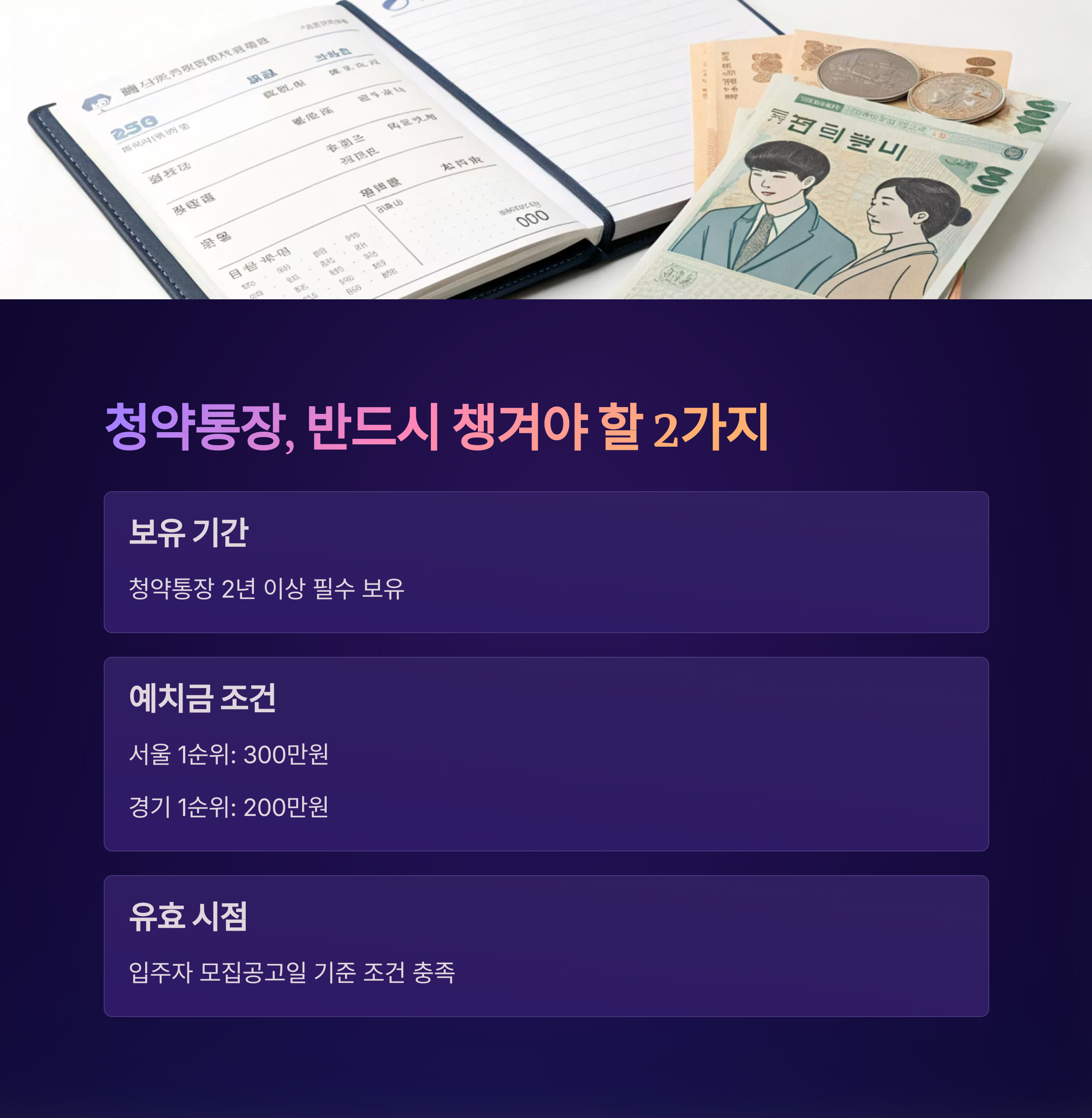 청약저축 통장은 최소 2년 이상 유지되어야 하며, 예치금도 지역과 면적에 맞게 충족돼야 합니다.