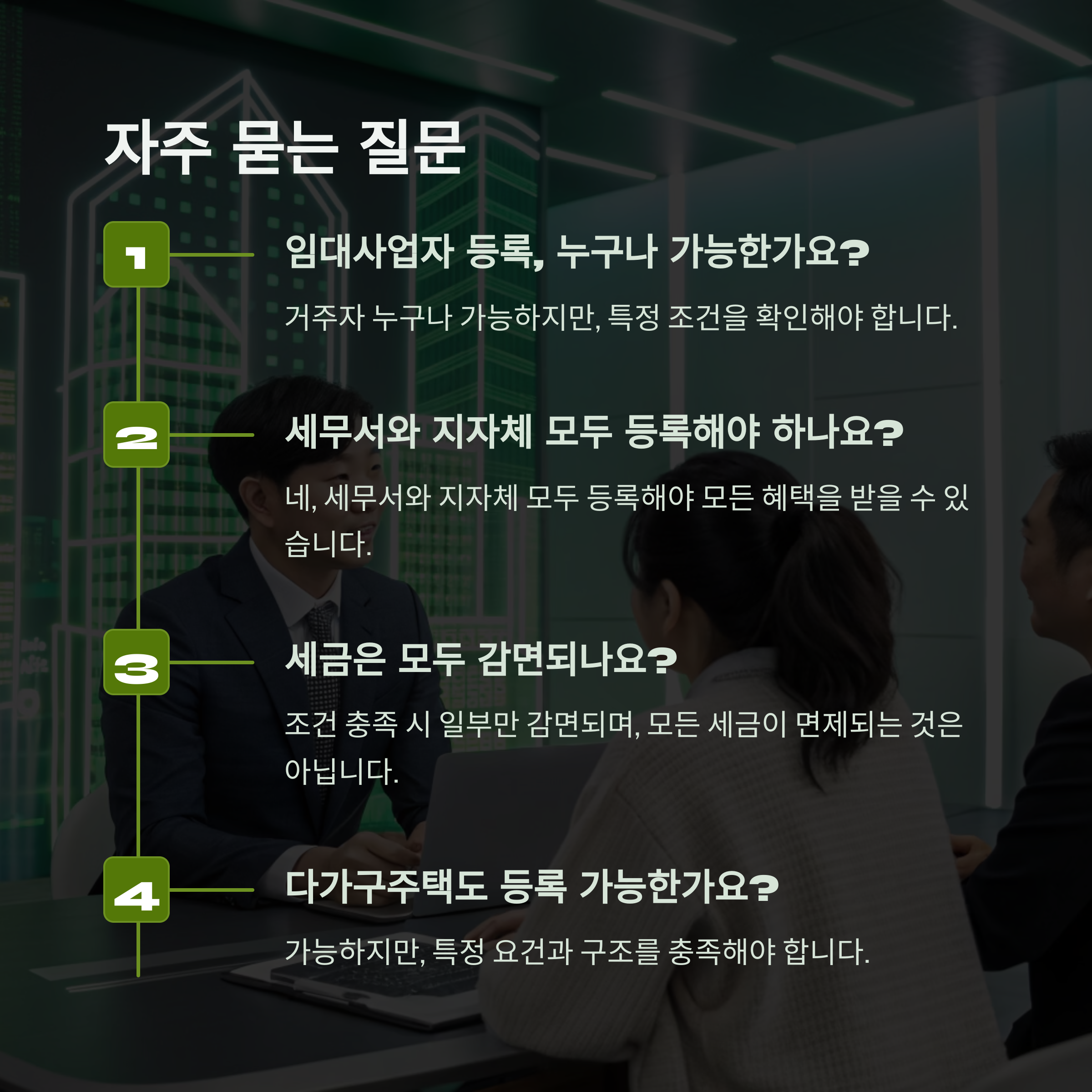 - 임대사업자 등록, 누구나 가능한가요? → 거주자 누구나 가능하나, 조건 확인 필요.