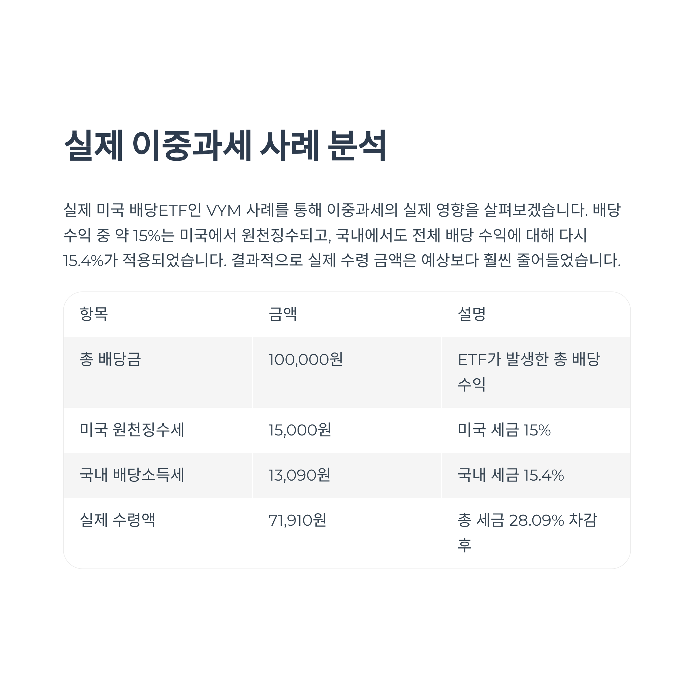 실제로 제가 보유한 ETF 중 미국 배당ETF인 VYM의 사례를 보면, 배당 수익 중 약 15%는 미국에서 원천징수되고, 국내에서도 전체 배당 수익에 대해 다시 15.4%가 적용되었습니다. 그 결과, 실제 수령 금액은 예상보다 훨씬 줄어들었죠.