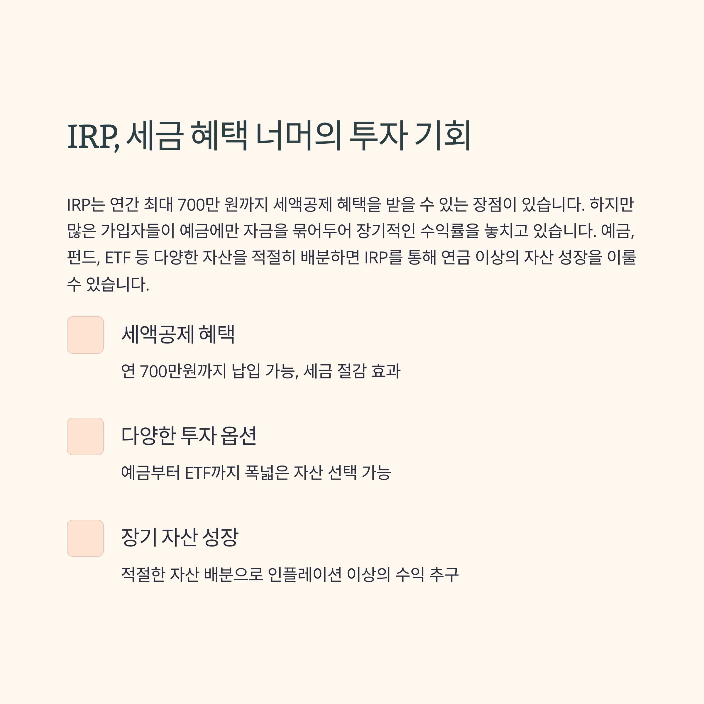 IRP는 연간 최대 700만 원까지 세액공제 혜택을 받을 수 있는 장점 외에도, 다양한 자산에 투자할 수 있는 구조입니다.