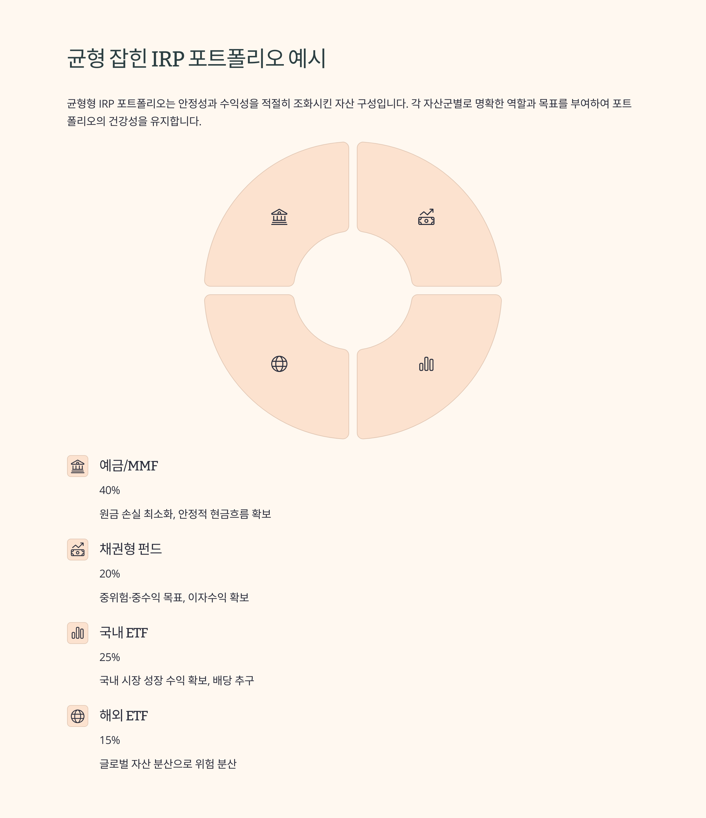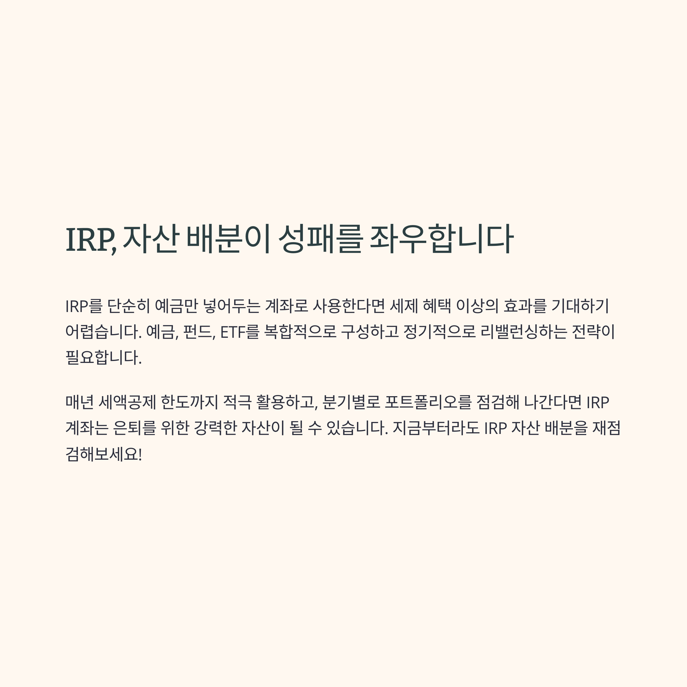 예금과 펀드, ETF 등 자산별 특징과 적정 비율을 이해하고 구성하면 IRP를 통해 연금 이상의 자산 성장이 가능합니다.