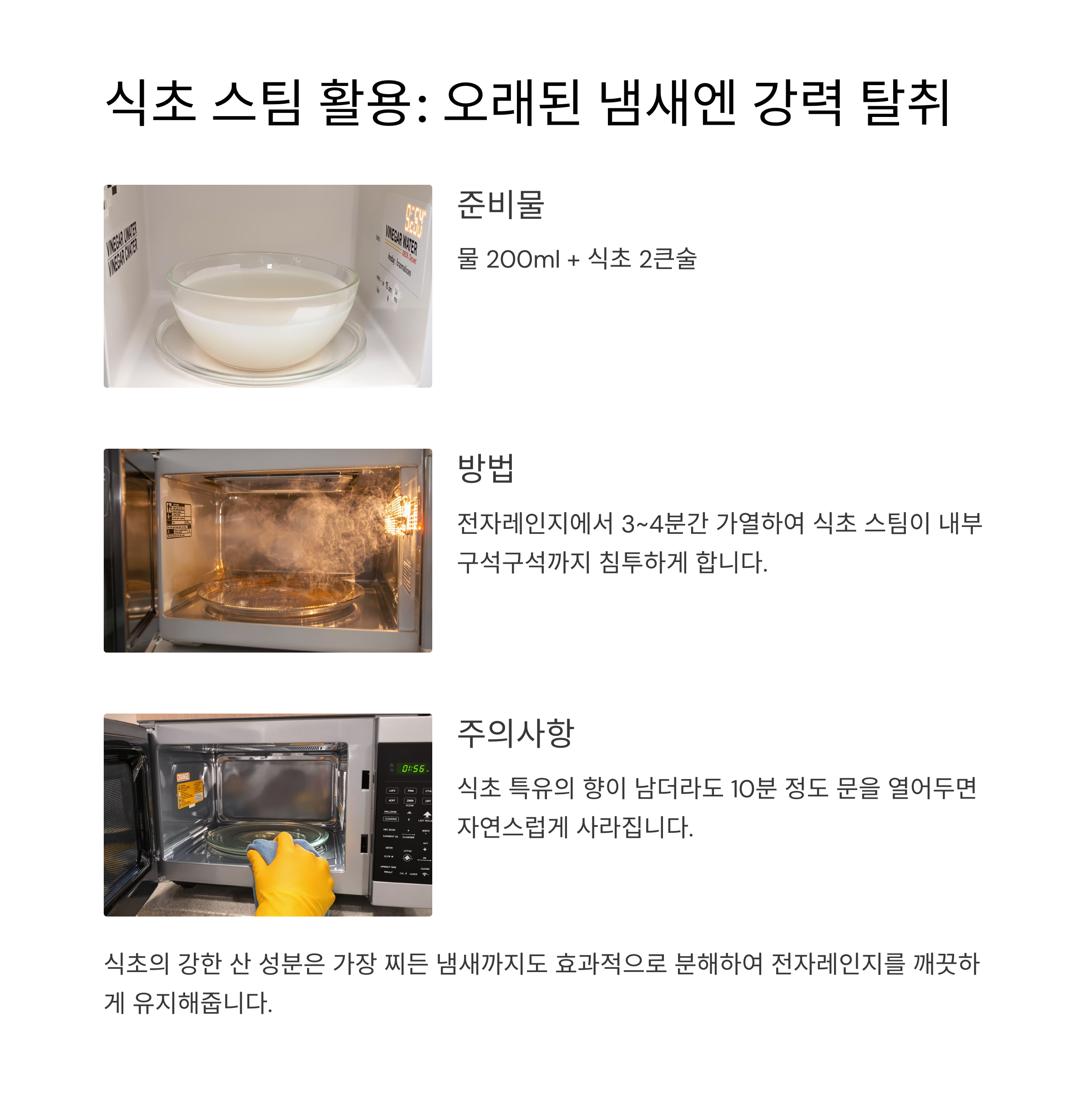 | 레몬 + 물 | 3분 가열 후 내부 닦기 | 냄새 중화 + 기름 제거 |