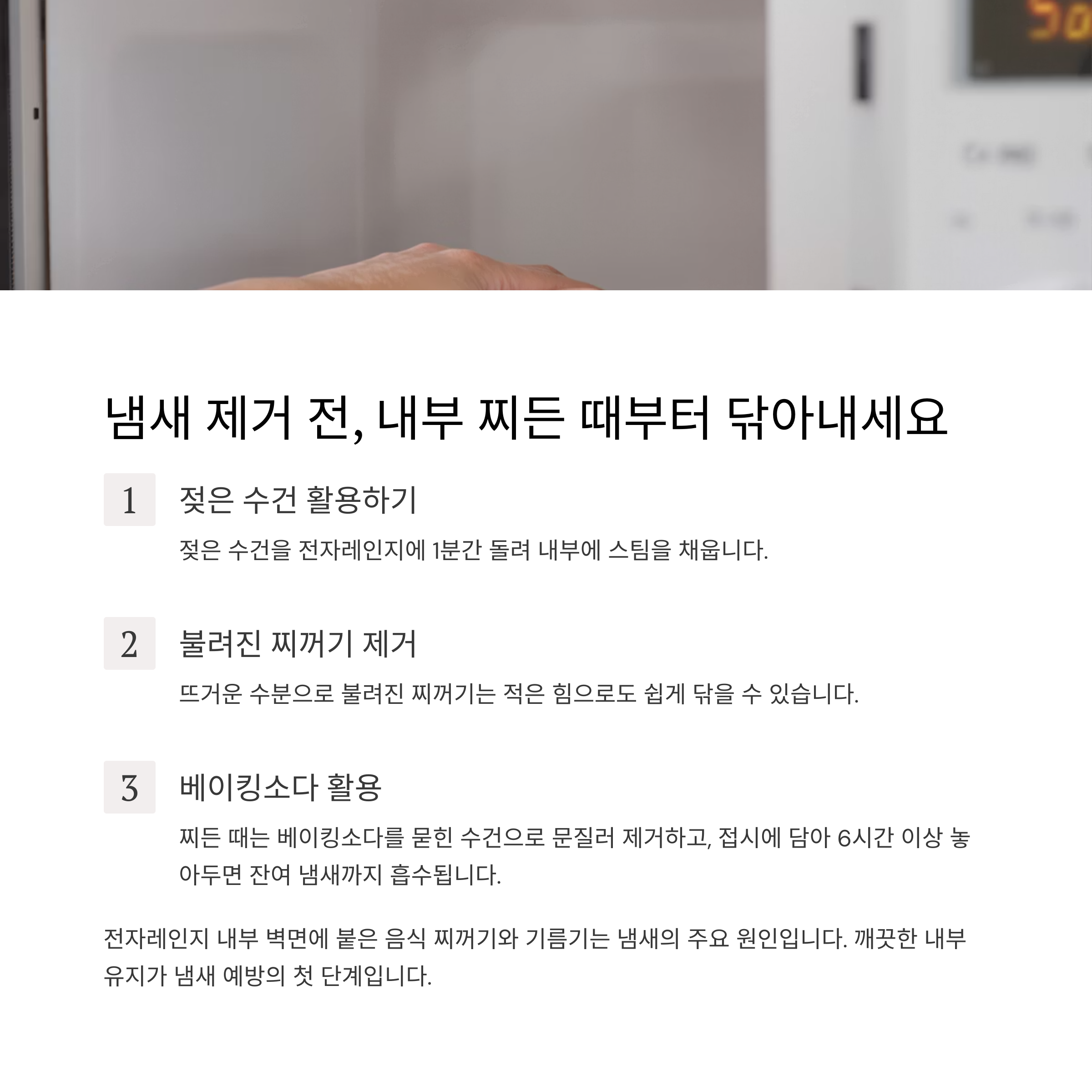 냄새 제거를 하기 전, 내부 벽면에 붙은 음식 찌꺼기나 기름기는 냄새를 붙잡는 주요 원인입니다. 젖은 수건을 전자레인지에 1분간 돌린 후 그 수건으로 내부를 문질러 닦아주세요. 뜨거운 수분으로 불려진 찌꺼기는 힘을 주지 않아도 쉽게 닦이며, 냄새도 함께 사라집니다.