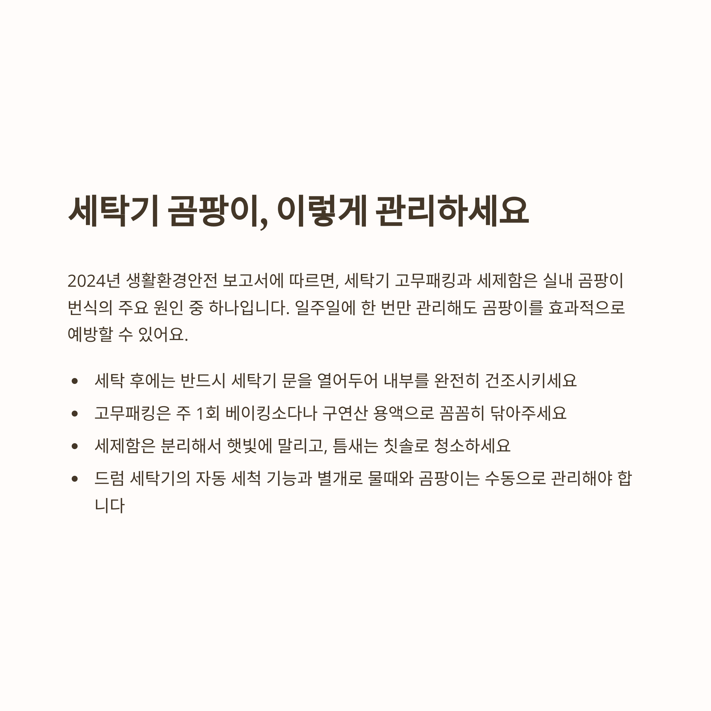 2024년 생활환경안전 보고서에 따르면 세탁기 고무패킹과 세제함은 실내 곰팡이 번식 원인 중 하나입니다. 세탁 후 문을 닫지 말고 완전히 열어두어 말리고, 패킹 안쪽은 주 1회 베이킹소다나 구연산으로 닦아주는 습관이 필요합니다. 드럼 세탁기의 경우 자동 세척 기능이 있어도 물때와 곰팡이는 따로 관리해야 예방 효과가 높습니다.
