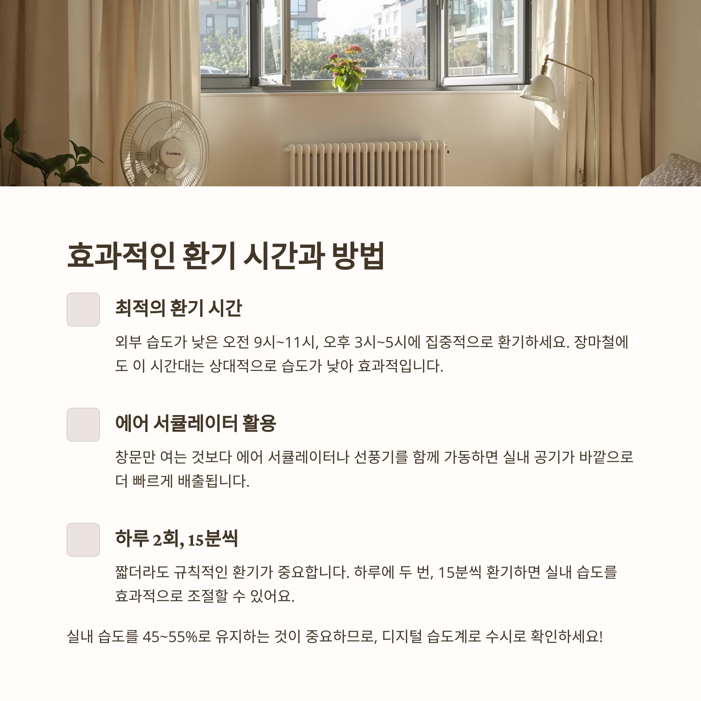 하루 2회, 15분 환기와 에어 서큘레이터로 공기 흐름 확보