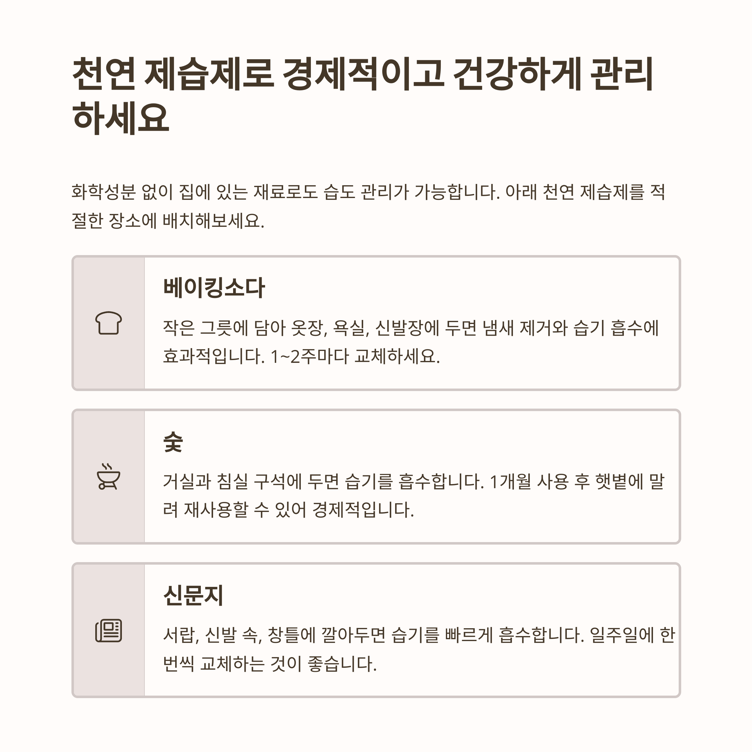 마트나 집에 있는 베이킹소다, 숯, 신문지 등을 활용하면 별도 장비 없이도 습도를 조절할 수 있습니다.