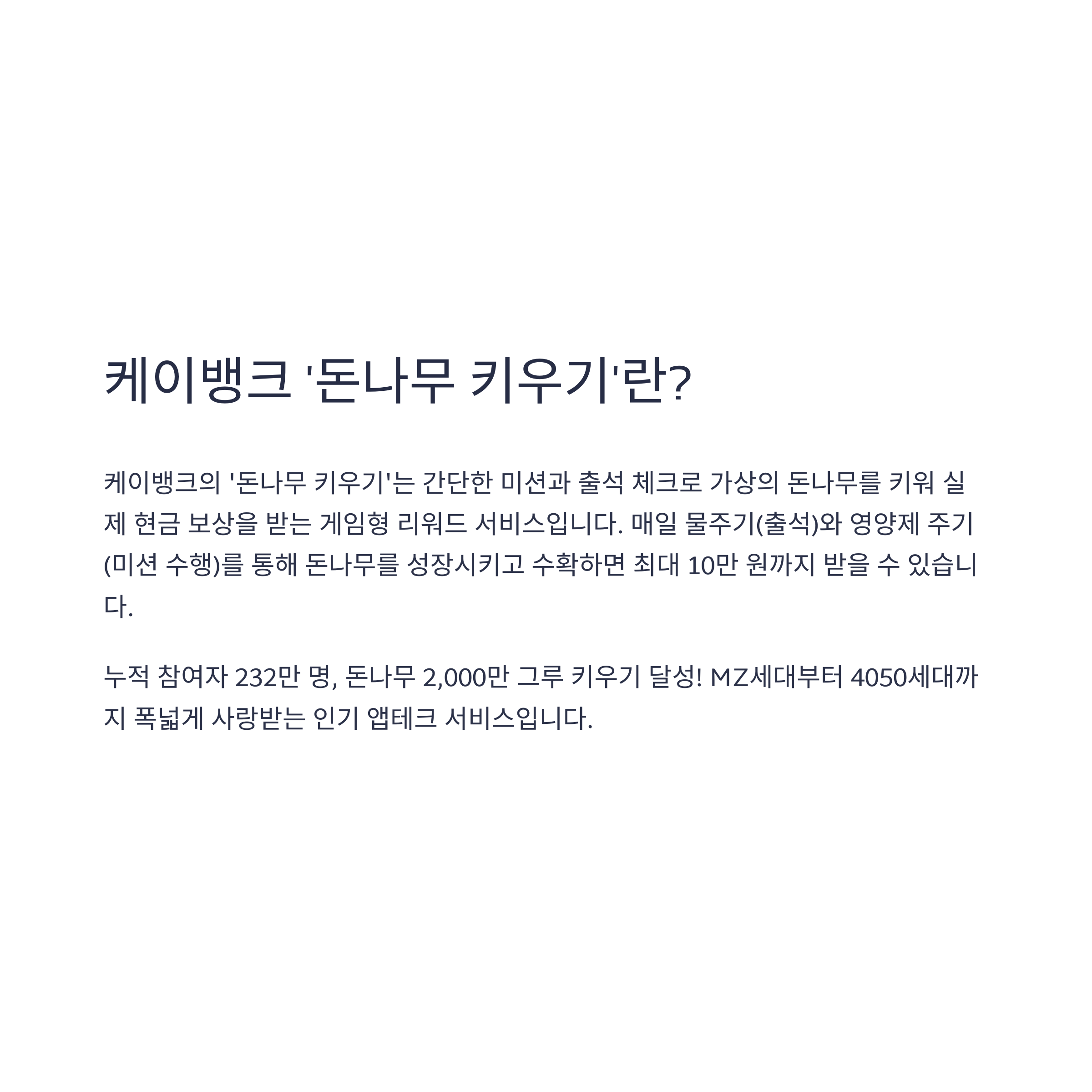 케이뱅크 ‘돈나무 키우기’는 매일 출석 체크와 간단한 미션 수행만으로 가상의 돈나무를 키우며 현금 보상을 받는 게임형 리워드 서비스입니다.